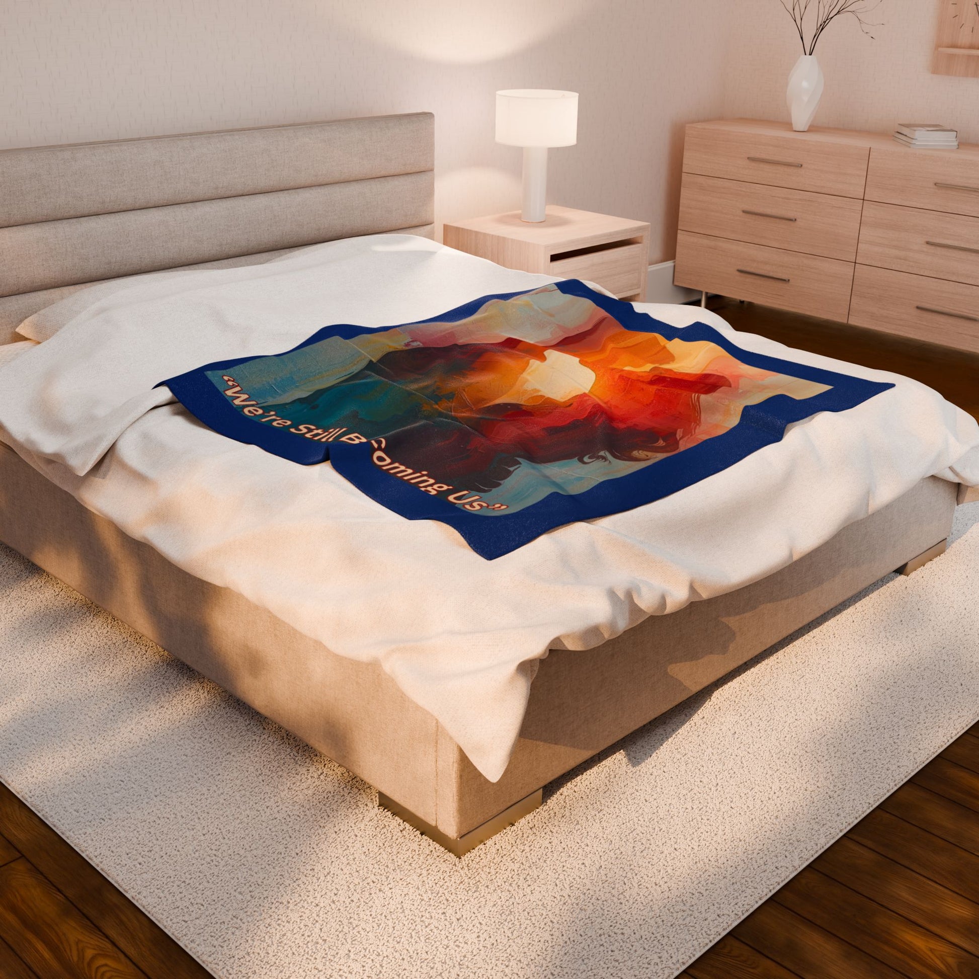 This velveteen plush blanket features the phrase 'We are still becoming us' in high detail and vibrant color, giving off a cozy and introspective vibe. Perfect for adults looking to add a touch of warmth and reflection to their home decor. Ideal for gifting on occasions like birthdays, anniversaries, or as a housewarming present.